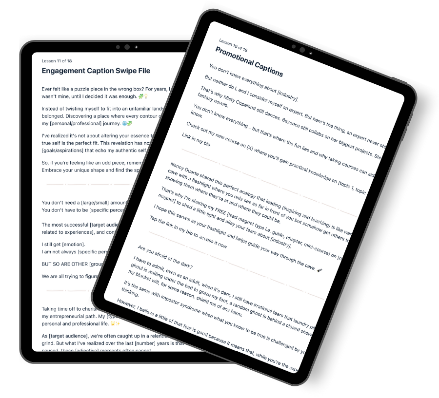 You’ll receive captivating Storytelling Posts, Engagement Caption Swipe Files, Promotional Captions for lead magnets and products, and a collection of 20 Blog/Video/Podcast Topics, ensuring you have all the inspiration and ready-to-use content you need to keep your audience hooked and increase engagement.