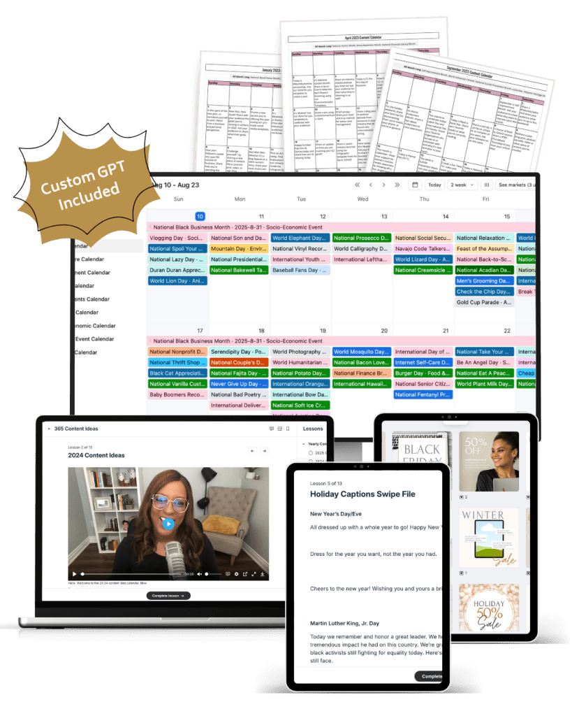 With 365 Content Ideas, you’re setting yourself and your business up for a year (or two) of content success, where every single post is catered to building a stronger, more connected community in less time than you can imagine. With the new GPT integration, you can skip straight from idea to polished draft—saving even more time while keeping every post in your voice.