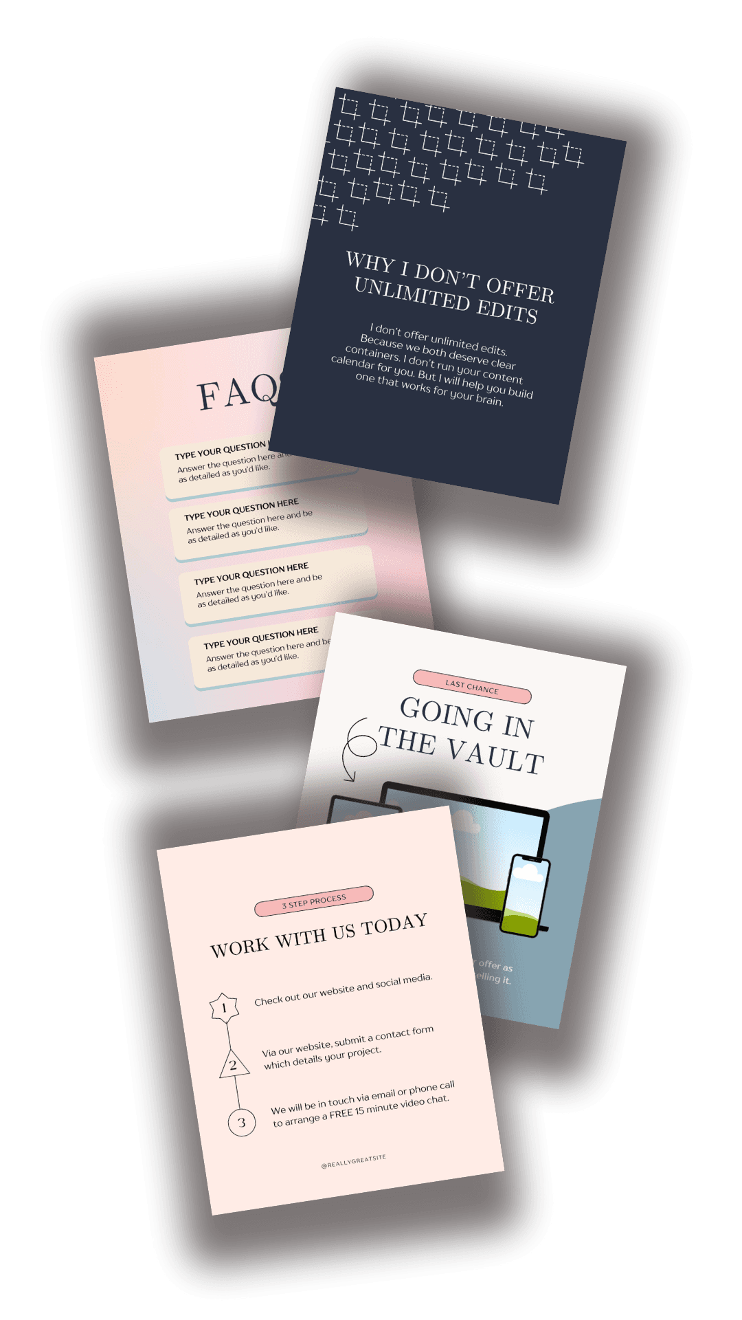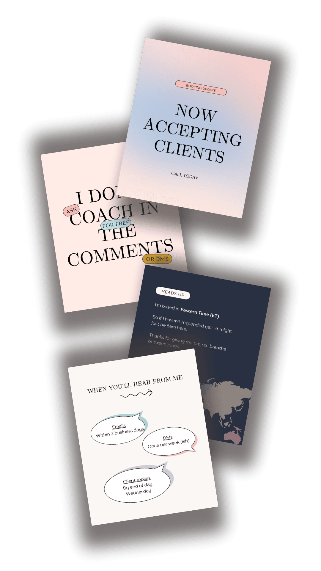 Whether you’re onboarding new clients, trying to explain (for the tenth time) that you don’t offer 24-hour turnaround, or just gently letting people know that you will, in fact, not be coaching in your DMs—these Canva templates have your back.