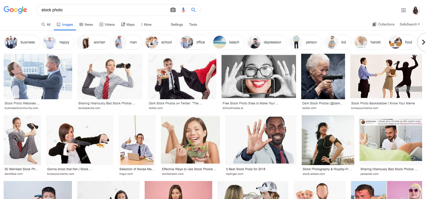 When you think about stock photos, you might imagine generic, boring stock images of people smiling while shaking hands in a conference room, or a woman laughing while eating a salad. That's the stereotype, right? They range from the boring to the bizarre.