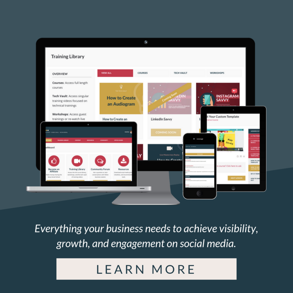 The Savvy Social School is a results-focused social media membership community with the tools and step-by-step training you need for a successful social media strategy. It's a toolbox to a successful social media strategy. (Personally, I like to think of it as the Netflix of social media training materials.)