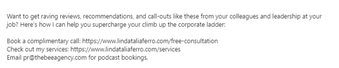 Executive coach Linda Taliaferro provides her links to book a complimentary consultation or visit her sales page.