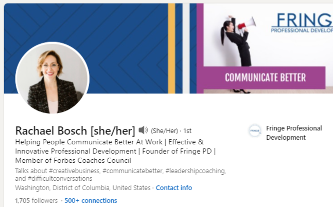 For example, the founder of Fringe Professional Development, Rachael Bosch includes her impressive history at Harvard Law School, her industry-specific skills in things like DiSC behavioral assessments and the EQi 2.0© emotional intelligence index. These immediately give you an idea of her expertise and her skills.