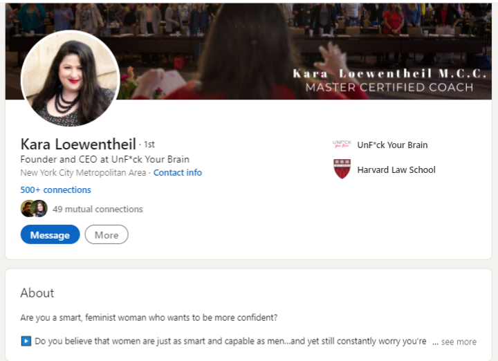 One of my clients (a badass feminist life coach) Kara Loewentheil uses a question for the hook of her summary section: “Are you a smart, feminist woman who wants to be more confident?”