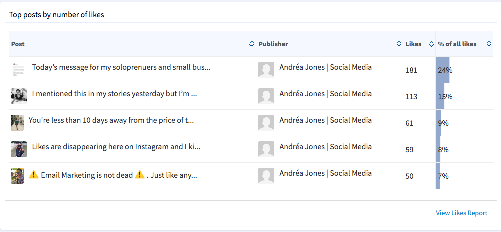 There are a number of breakdowns you can use across the different platforms, but I recommend keeping an eye on post engagement, engagement per follower, and total engagement.